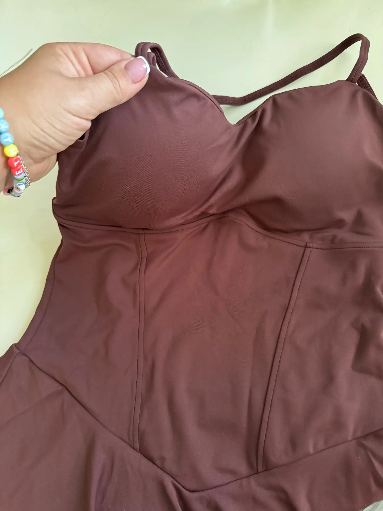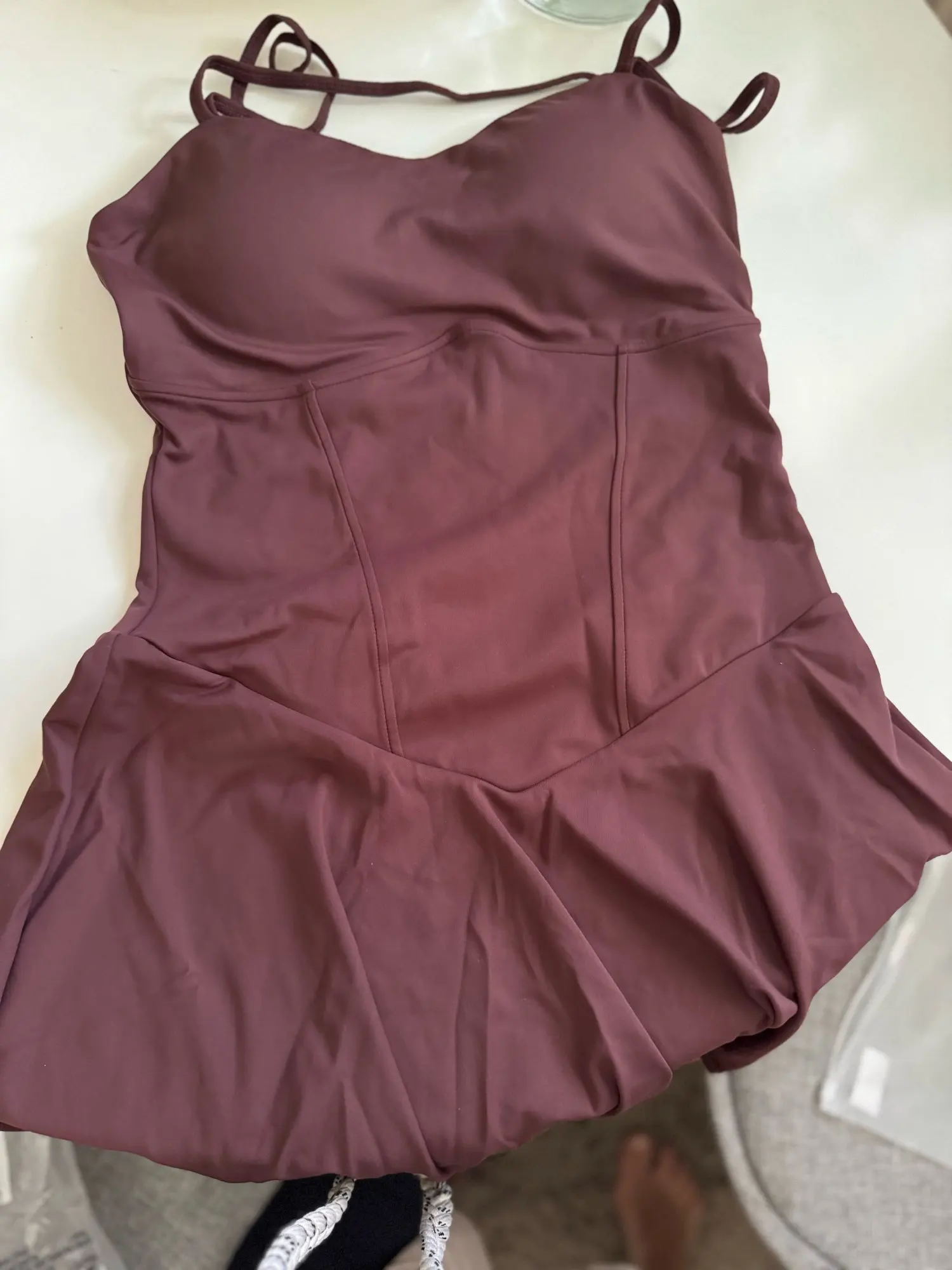 A flattering activewear mini dress with a sweetheart neckline, adjustable straps, and a flared skirt layered over built-in shorts with pockets. Made from soft, stretchy fabric for comfort and freedom of movement.